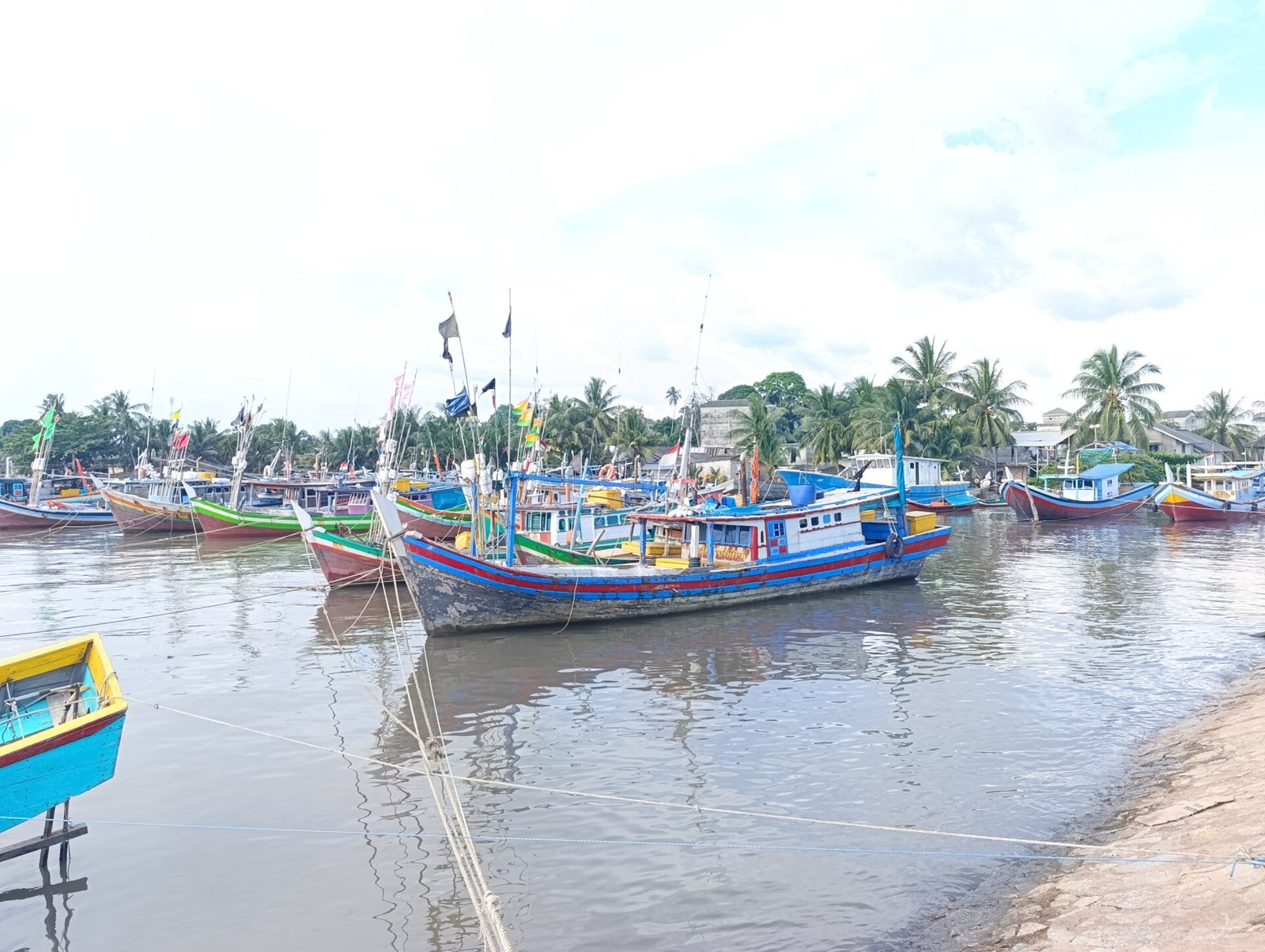Beberapa perahu nelayan juga tampak bersandar di sisi kanan kanal tersebut, terangkat oleh tingginya permukaan air.