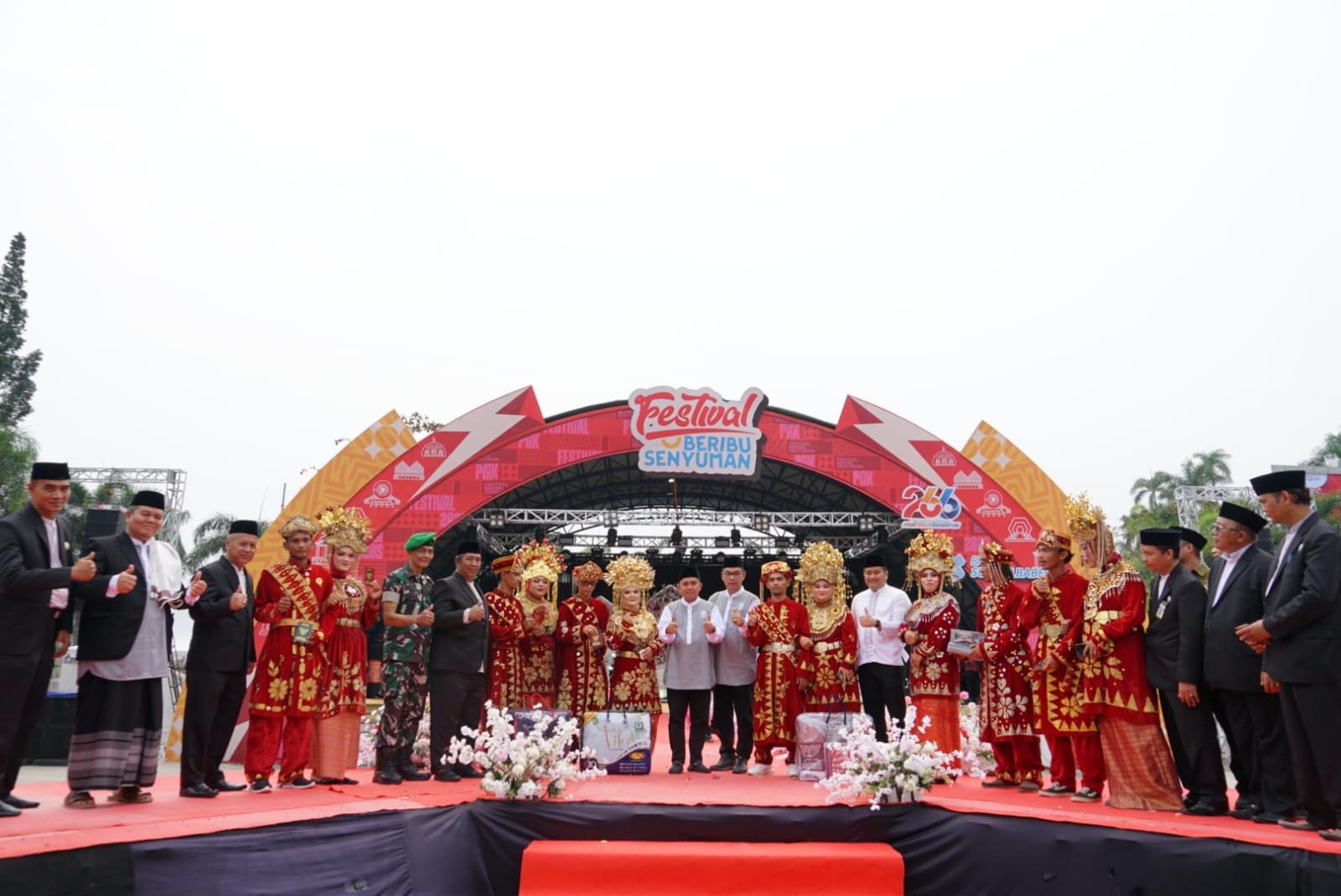 Para pengantin ini sebelumnya diarak dari rumah dinas wali kota ke Alun-alun Taman Merdeka. Mereka memakai baju adat pengantin Paksian Bangka Belitung berwarna merah lengkap dengan riasan wajah.