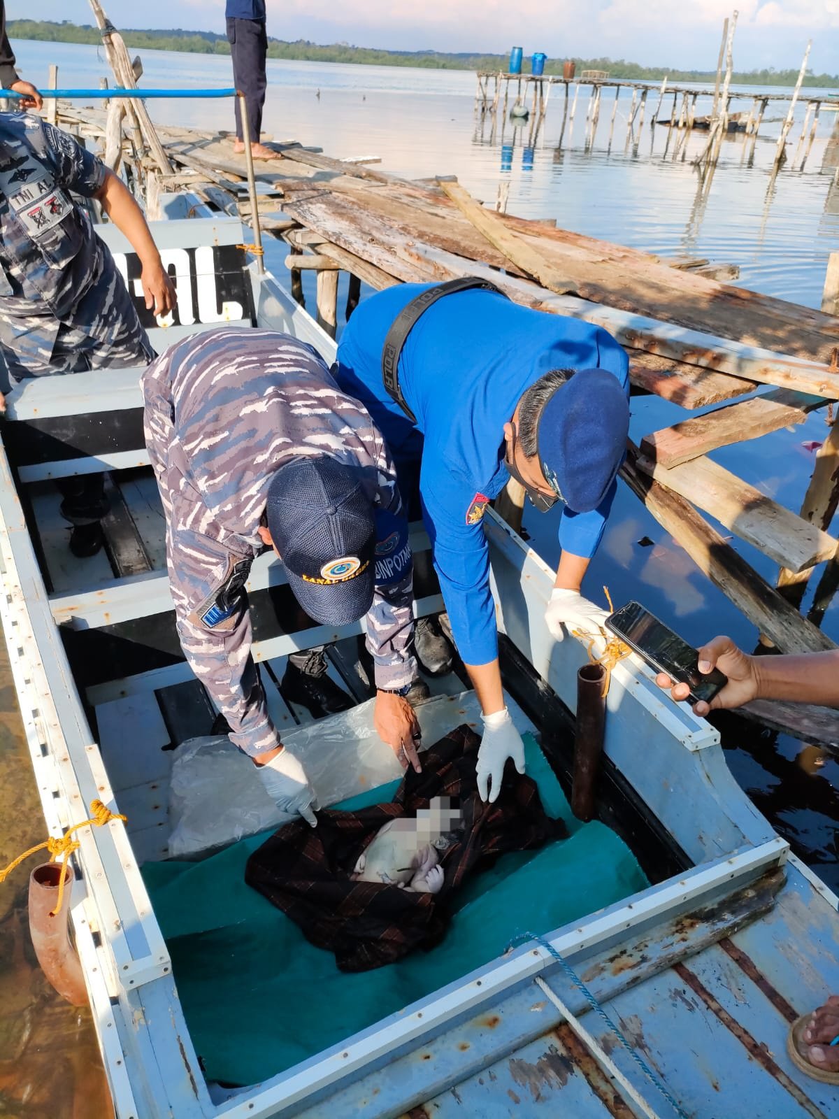 TOBOALI, ERANEWS.CO.ID- Danposmat AL Sadai berhasil mengevakuasi jenazah bayi jenis laki-laki di jembatan dekat pulau tinggi, Desa Penutuk, Kabupaten Bangka Selatan, Kamis (17/3/2022).