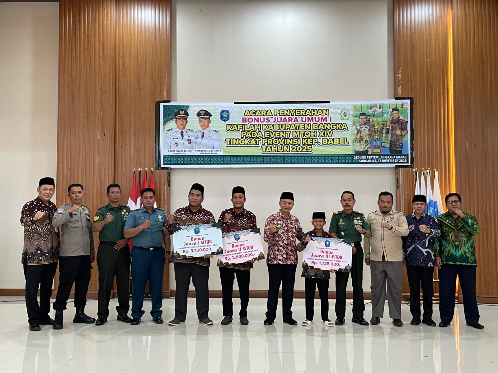BANGKA, ERANEWS.CO.ID – Wakil Bupati Bangka, Syahbudin, S.IP., M.Tr.Ip, menyerahkan bonus kepada para kafilah Kabupaten Bangka yang berhasil meraih Juara Umum I pada MTQH XIV Tingkat Provinsi Bangka Belitung, Kamis (27/11/2025) di Gedung Pertemuan Graha Maras.