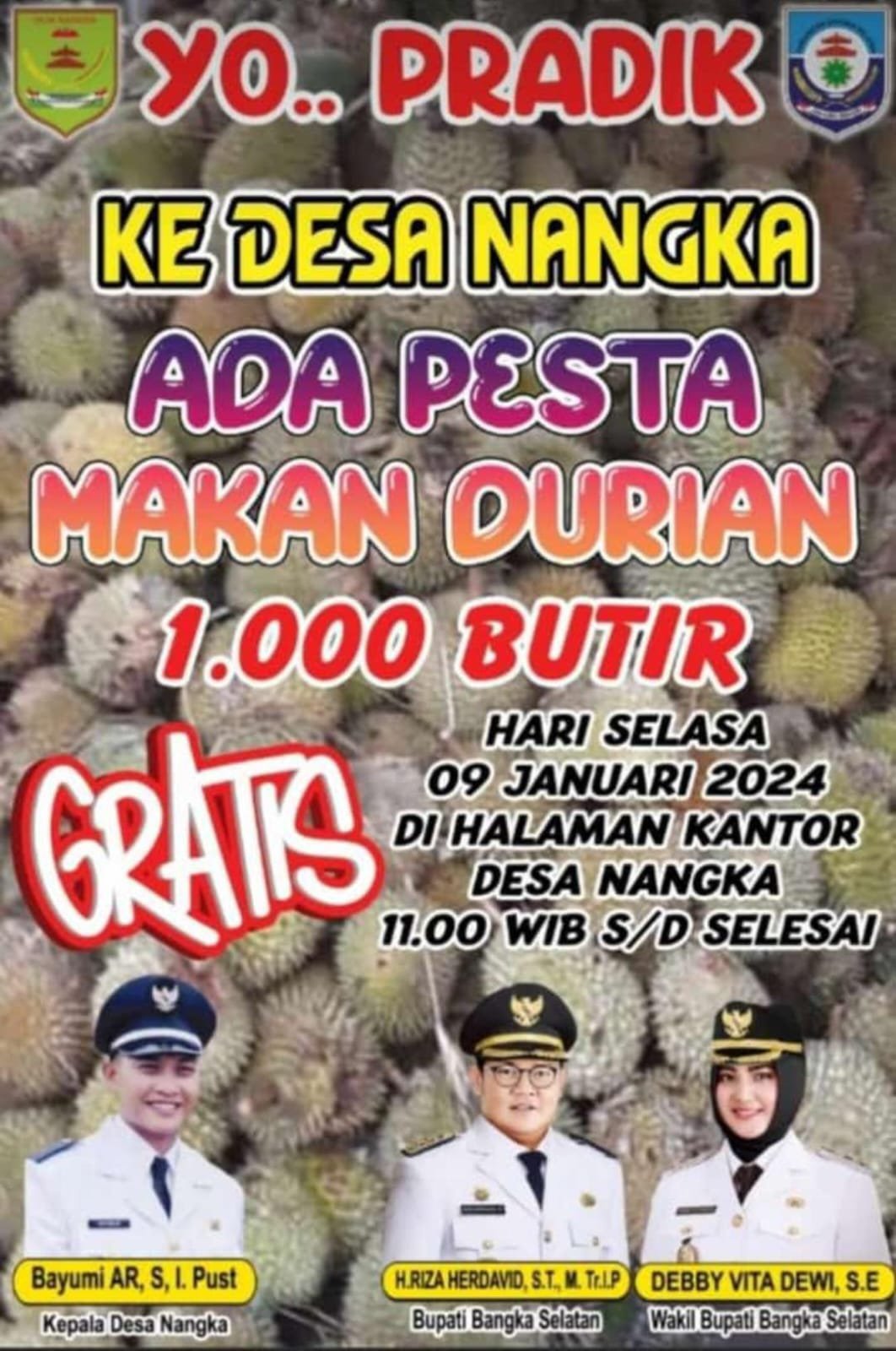 AIRGEGAS, ERANEWS.CO.ID- Pemerintah Desa (Pemdes) Nangka, Kecamatan Airgegas, Kabupaten Bangka Selatan (Basel) akan menggelar kegiatan Pesta Makan Durian 1000 butir gratis pada Tanggal 9 Januari Tahun 2024.