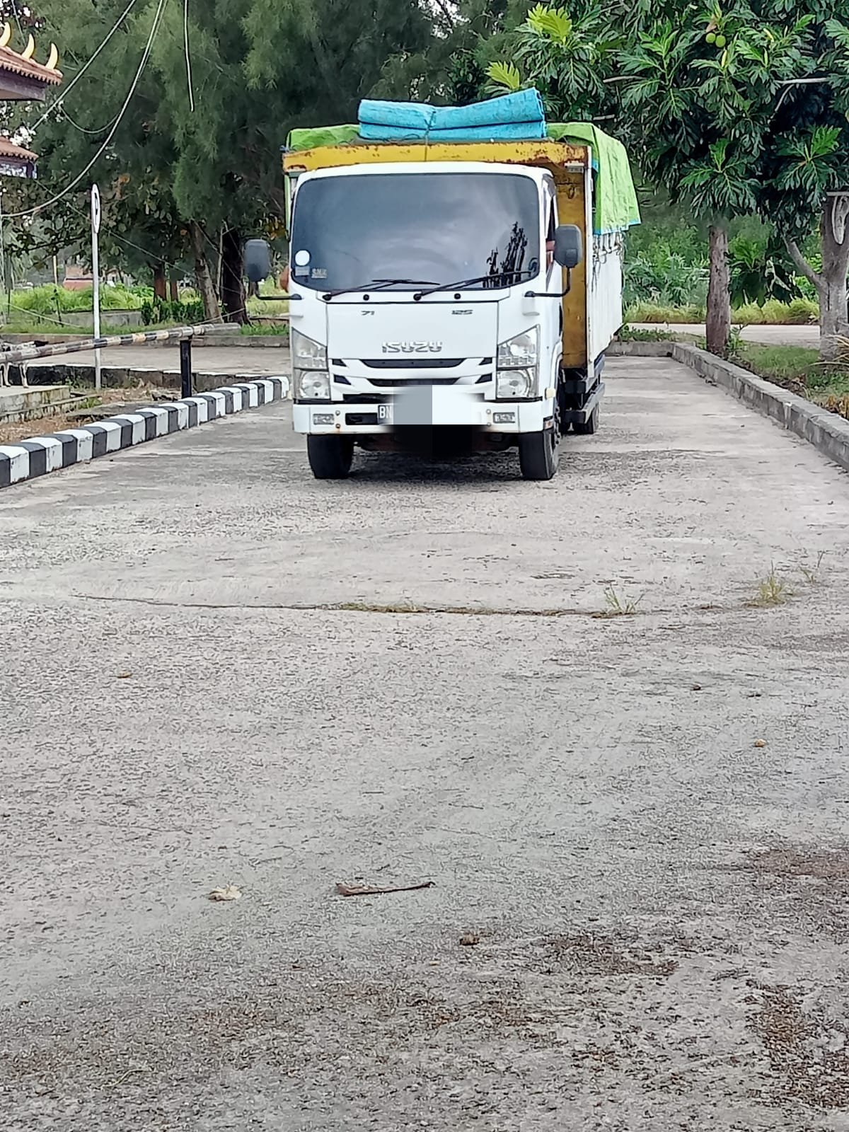 Truk Isuzu berwarna putih dengan bak tertutup terpal hijau tersebut diduga mengangkut pasir timah dengan modus menyamarkannya sebagai sagu.