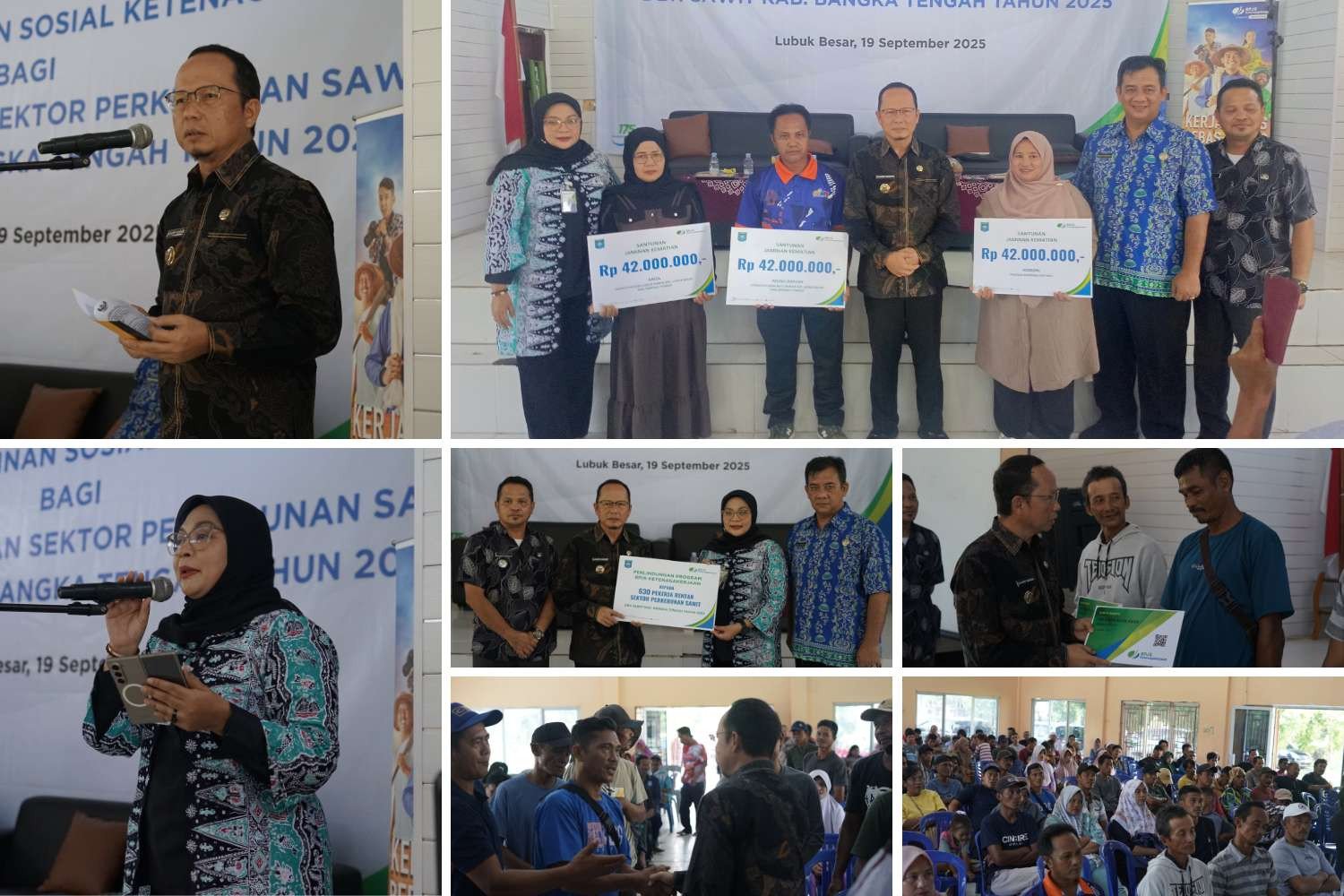 Pada kesempatan ini, Bupati Bangka Tengah juga menyerahkan tiga santunan Jaminan Kematian sebesar Rp42 juta kepada masing-masing keluarga ahli waris serta secara simbolis kartu BPJS Ketenagakerjaan kepada pekerja perkebunan sawit.