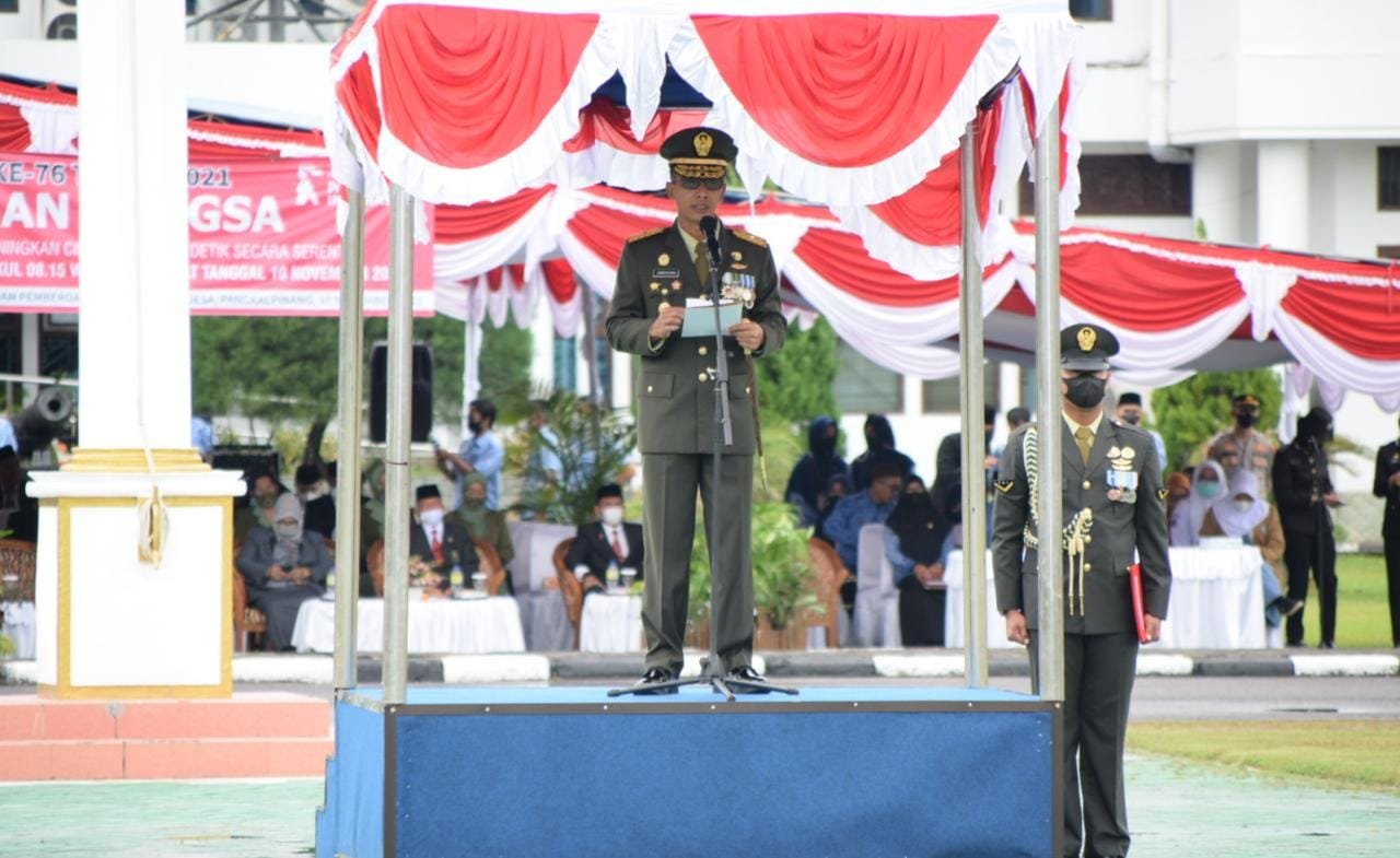 PANGKALPINANG, ERANEWS.CO.ID — Peringatan Hari Pahlawan Ke-76, Tahun 2021 di Provinsi Kepulauan Bangka Belitung di pusatkan di Kantor Gubernur Babel Rabu 10/11/2021 dengan Inspektur Upacara (Irup) Danrem 045/Garuda Jaya Brigjen TNI M Jangkung Widyanto, S.I.P., M.Tr.(Han).