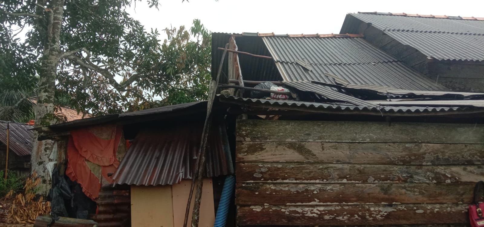 TOBOALI, ERANEWS.CO.ID- Dua Rumah di Desa Permis, Kecamatan Simpang Rimba, Kabupaten Bangka Selatan mengalami rusak akibat hujan lebat yang mengguyur desa tersebut, Senin (24/7/2023).