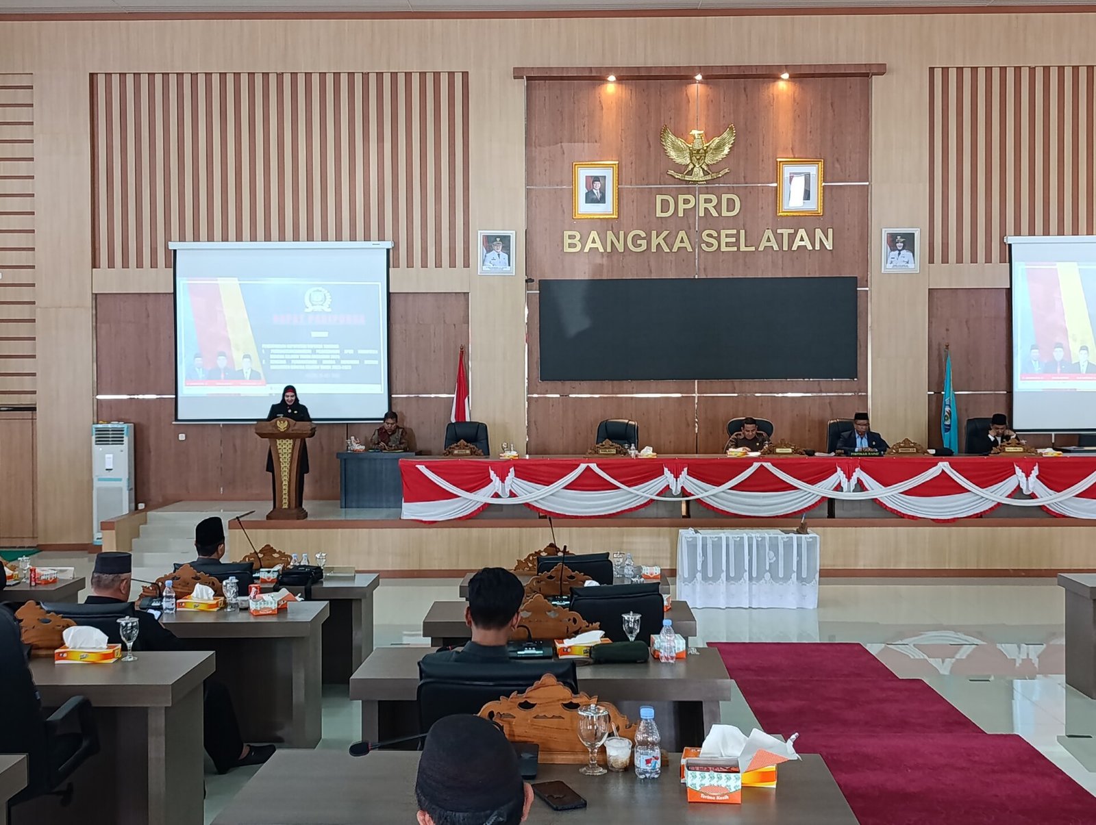 Rapat yang berlangsung di Ruang Gedung Paripurna DPRD Kabupaten Bangka Selatan ini dihadiri oleh Ketua DPRD Bangka Selatan, Erwin Asmadi, bersama Wakil Ketua H. Komarudin dan Rusi Sartono, serta anggota DPRD lainnya.