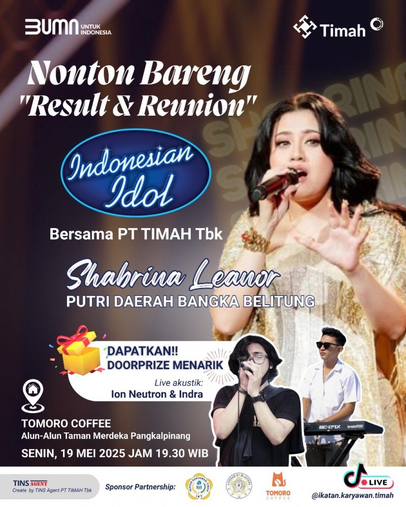 PANGKALPINANG — Untuk mendukung talenta muda Provinsi Kepulauan Bangka Belitung, Shabrina Leanor yang sedang berlaga dalam Grand Final Indonesia Idol, PT Timah menggelar nonton bareng (nobar) di tiga titik.