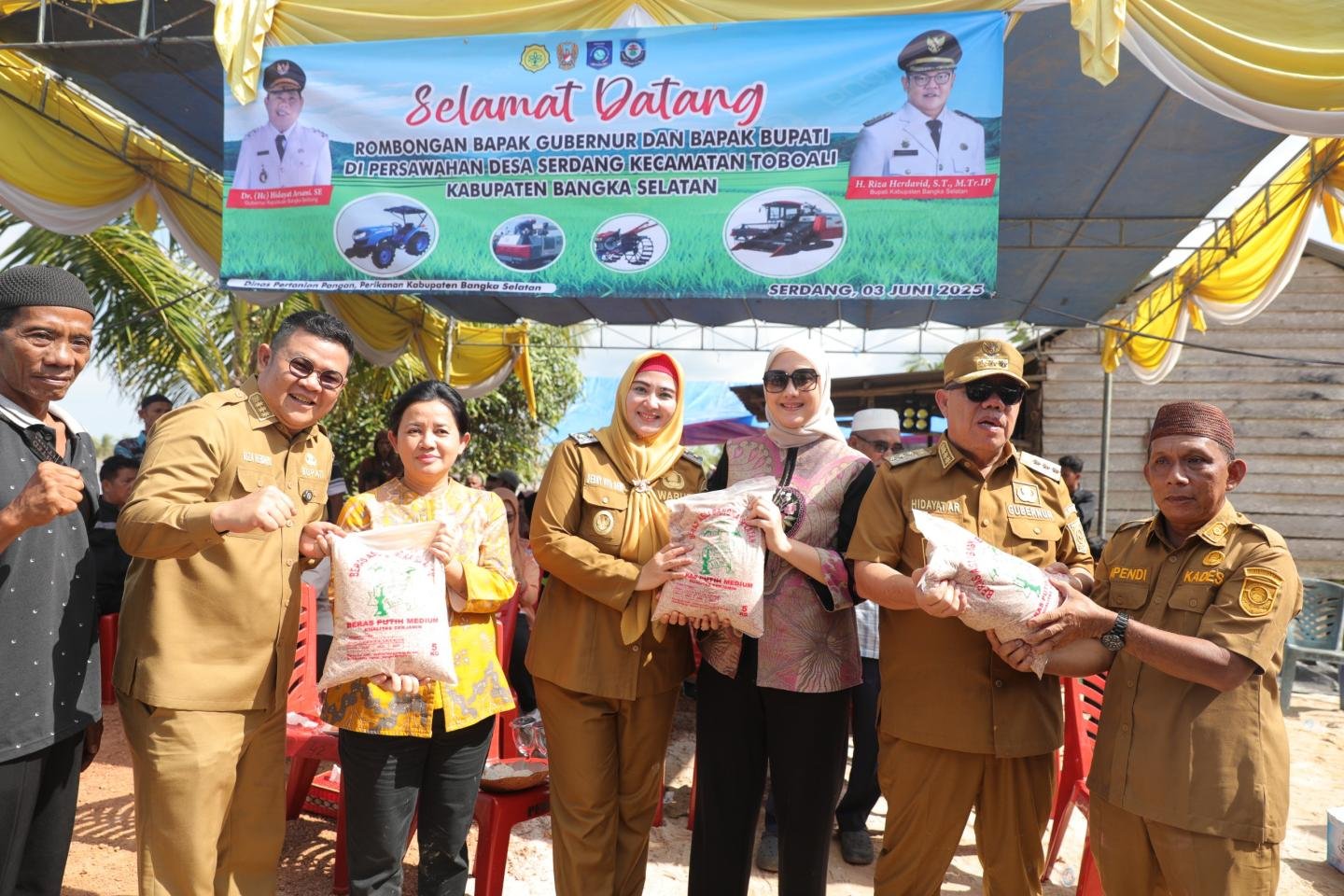 Gubernur Kepulauan Bangka Belitung (Kep. Babel) Hidayat Arsani didampingi Ketua TP PKK Kep. Babel Noni Hidayat Arsani, Bupati Basel Riza Herdavid, Wakil Bupati Basel Debby Vita Dewi, beserta Forkopimda dan Kepala Perangkat Daerah Kabupaten Bangka Selatan, menandai penanaman padi serentak yang digelar Dinas Pertanian, Pangan, dan Perikanan (DPPP) Kabupaten Bangka Selatan.