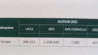 Adapun Keputusan kepala Dinas Pertanian dan Ketahanan Pangan Provinsi Kepulauan Bangka Belitng nomor 188.4/136/kpts/dpkp/2025 tentang Alokasi Pupuk Bersubsidi Sektor Pertanian TA 2026.