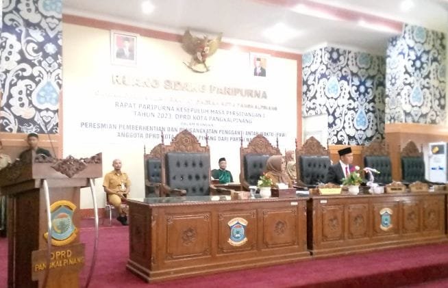 PANGKALPINANG, ERANEWS – Ketua DPRD Kota Pangkalpinang, Abang Hertza memimpin Rapat Paripurna ke Sepuluh Masa Persidangan I Tahun 2023 DPRD Kota Pangkalpinang dengan Agenda Peresmian Pemberhentian dan Pengangkatan Pengganti Antar Waktu (PAW) Anggota DPRD Kota Pangkalpinang dari Partai Nasdem, di Ruang Sidang Paripurna DPRD Kota Pangkalpinang, Senin (11/12/23).