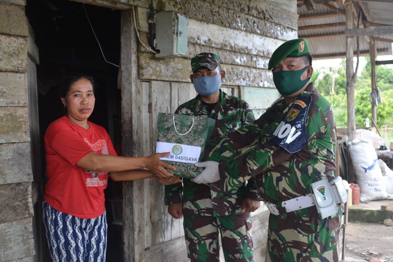 Menurut Danrem 045/Gaya Kolonel Czi M. Jangkung Widyanto, pembagian sembako ini dengan menggunakan protap kesehatan selama pandemi corona, dengan mendatangi langsung ke rumah warga, tujuannya agar tidak terjadi kerumunan warga.
