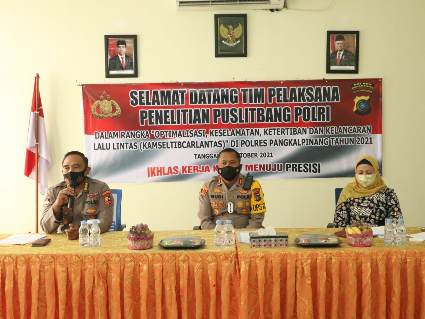 PANGKALPINANG, ERANEWS.CO.ID — Polres Pangkalpinang menerima kunjungan dari Tim Puslitbang Polri dalam rangka penelitian tentang Optimalisasi tingkat pengguna jalan yang berkeselamatan untuk mewujudkan keamanan keselamatan, ketertiban dan kelancaran lalu lintas di wilayah Polda Kep. Babel, khususnya di Polres Pangkalpinang, Selasa(05/10/2021).