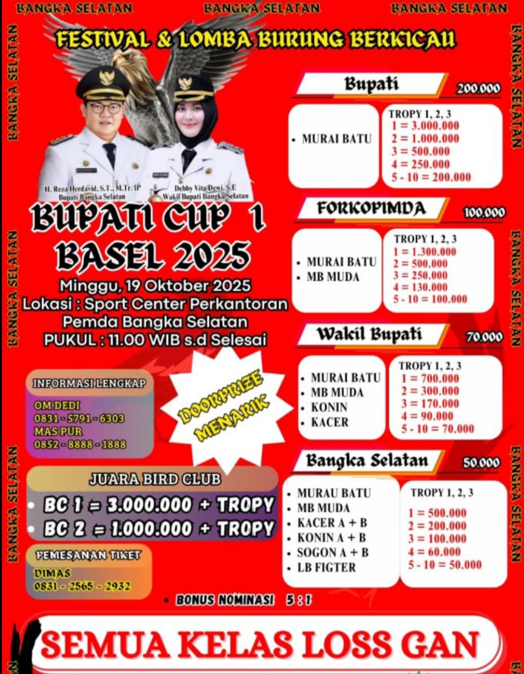 TOBOALI, ERANEWS.CO.ID – Pemerintah Kabupaten Bangka Selatan akan mengadakan festival burung berkicau bertajuk Bupati Cup 1. Acara yang dijadwalkan pada hari Minggu, 19 Oktober 2025, ini tidak hanya menjadi ajang kompetisi, tetapi juga wadah untuk mempererat tali silaturahmi di antara para pencinta burung.