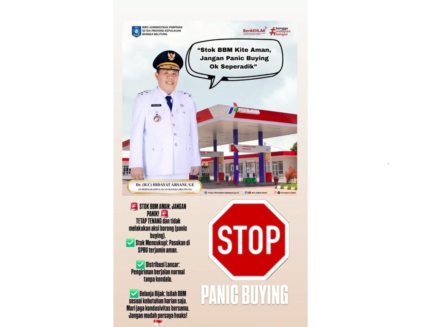 Berdasarkan hasil koordinasi dengan pihak Pertamina, pasokan bahan bakar minyak (BBM) untuk wilayah Babel dalam kondisi aman. “Oleh karena itu, masyarakat diminta untuk tidak melakukan pembelian secara berlebihan,” imbaunya.