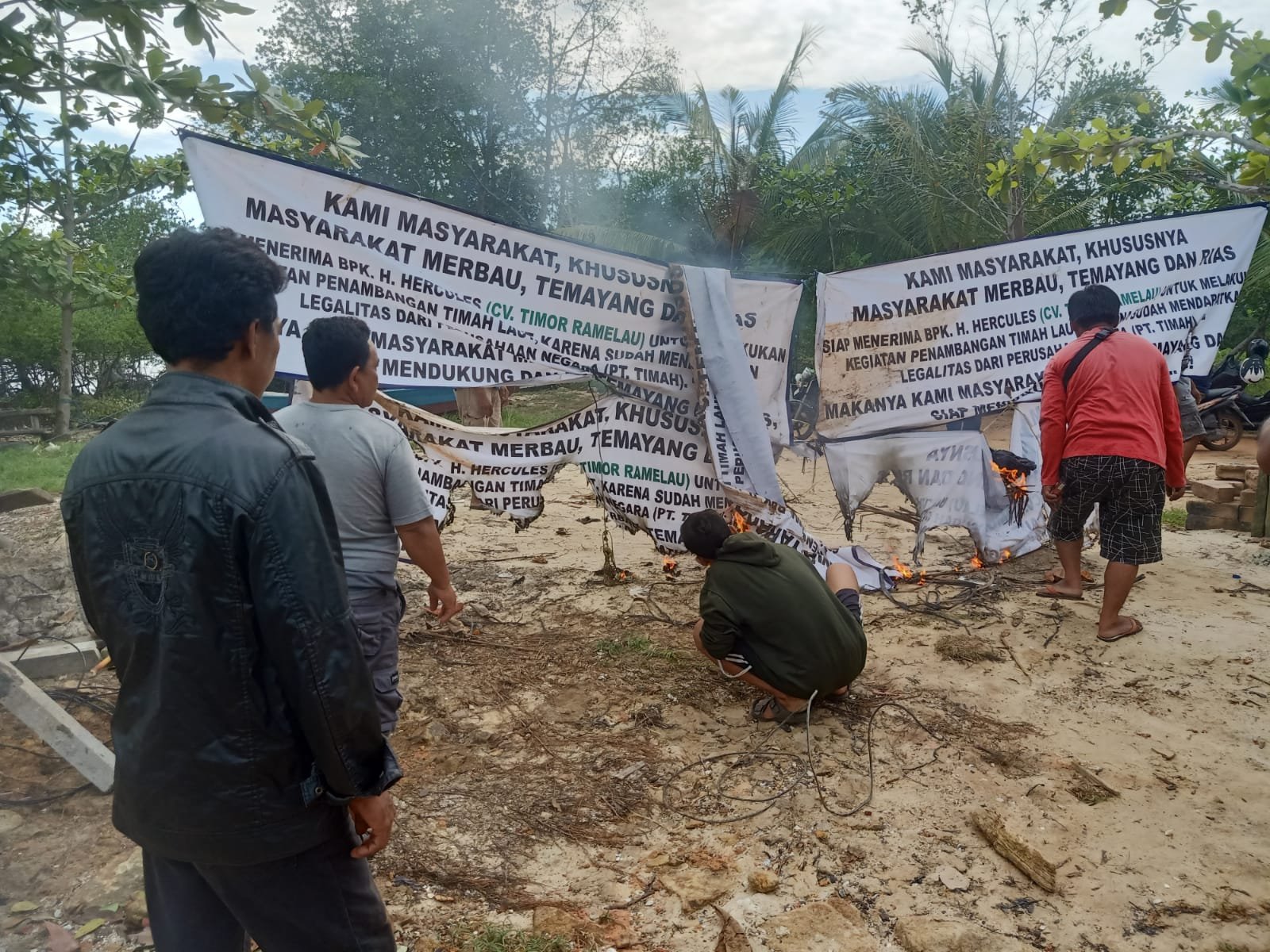 Pantauan di lapangan, puluhan masyarakat mengumpulkan spanduk tersebut untuk dibakar di pesisir pantai Merbau.