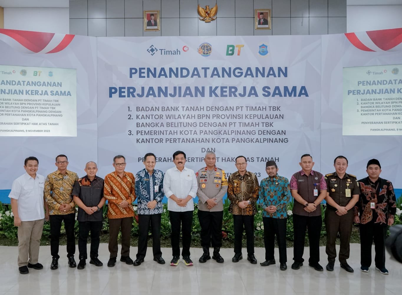 PANGKALPINANG, ERANEWS.CO.ID – Pemerintah Kota Pangkalpinang gelar penandatanganan perjanjian kerjasama dengan Kantor Pertanahan Kota Pangkalpinang dan penyerahan sertifikat hak atas tanah. Selain itu, penandatanganan kerjasama ini juga dilakukan antara Badan Bank Tanah dengan PT. Timah. Tbk dan Kantor Wilayah BPN Provinsi Kepulauan Bangka Belitung dengan PT. Timah. Tbk di Gedung Graha kantor pusat PT. Timah. Tbk Kota Pangkalpinang, Kamis (9/11/2023).