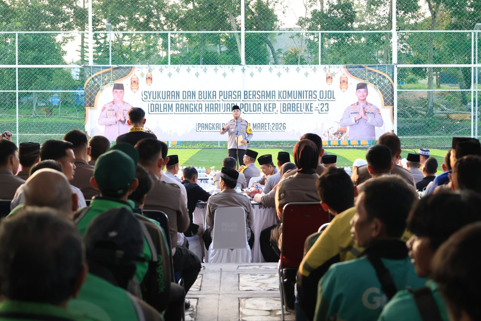 Polda Bangka Belitung menggelar buka bersama dengan komunitas pengemudi ojek online Pangkalpinang, Jumat (13/3/2026). Momen itu juga berbarengan dengan syukuran Hari Jadi Polda Babel ke 23 tahun.