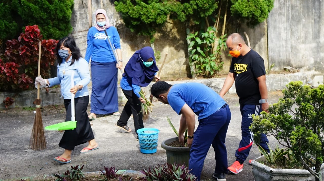 PANGKALPINANG, ERANEWS.CO.ID — Walikota Pangkalpinang, Maulan Aklil (Molen) bersama pegawai di BUMN Perusahaan Air Minum (PDAM) Tirta Pinang menggelar gotong royong, Selasa (05/01/21). Kegiatan itu dilakukan di