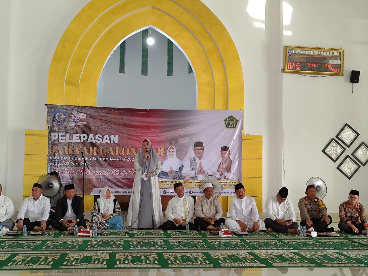TOBOALI, ERANEWS.CO.ID- Wakil Bupati Bangka Selatan, Debby Vita Dewi melakukan pelepasan secara seremonial pemberangkatan jemaah calon haji Kabupaten Bangka Selatan Tahun 2023 di Masjid Agung Abdulrahman Pemkab Bangka Selatan, Sabtu (3/6/2023).