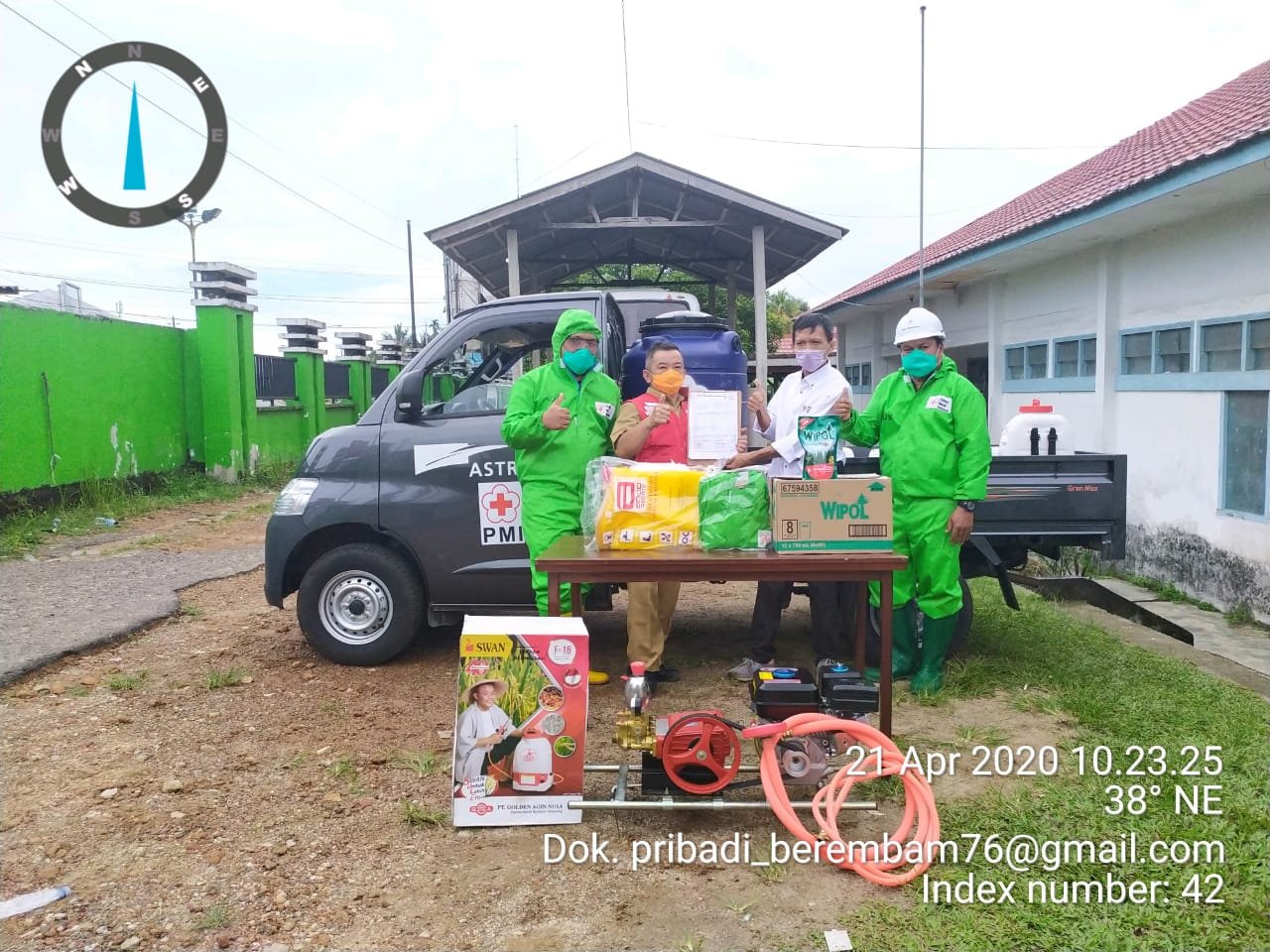 Bantuan berupa 1 unit mobil operasional beserta peralatan semprot disinfektan, terdiri dari 2 buah tandon air, 1 set mesin air, cairan disinfektan 60 dus, baju APD 4 unit, sepatu boot 4 unit, dan alat semprot 4 unit itu, diserahkan oleh Dewan Kehormatan PMI Babel, Marwansyah kepada Ketua PMI Kabupaten Belitung yang diwakili Ketua Bidang Relawan PMI Belitung, Mustafa di Halaman Markas PMI Belitung.