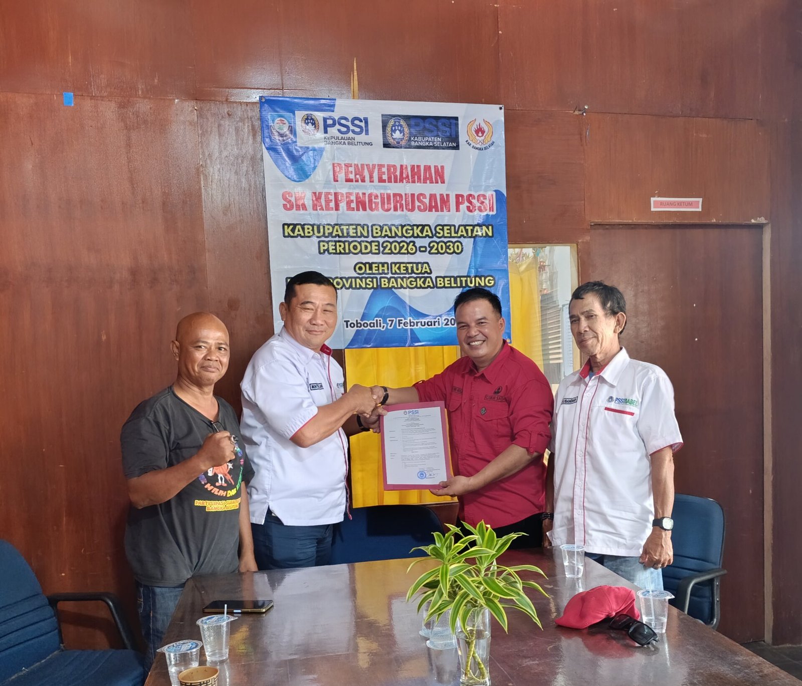 TOBOALI, ERANEWS.CO.ID – Ketua PSSI Provinsi Bangka Belitung, Mintra Jaya, yang akrab disapa Akwen, resmi menyerahkan Surat Keputusan (SK) Kepengurusan PSSI Kabupaten Bangka Selatan periode 2026-2030 di Ruang Rapat KONI Bangka Selatan.