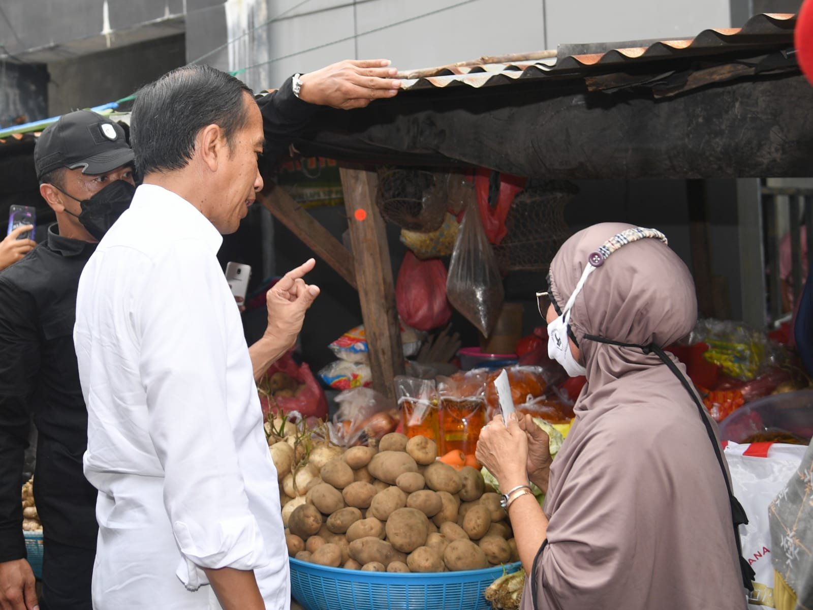 Kemudian Presiden kembali berjalan ke arah belakang pasar sembari kembali menyapa pedagang dan membagikan kaos dan paket sembako kepada para pedagang dan warga yang hadir.