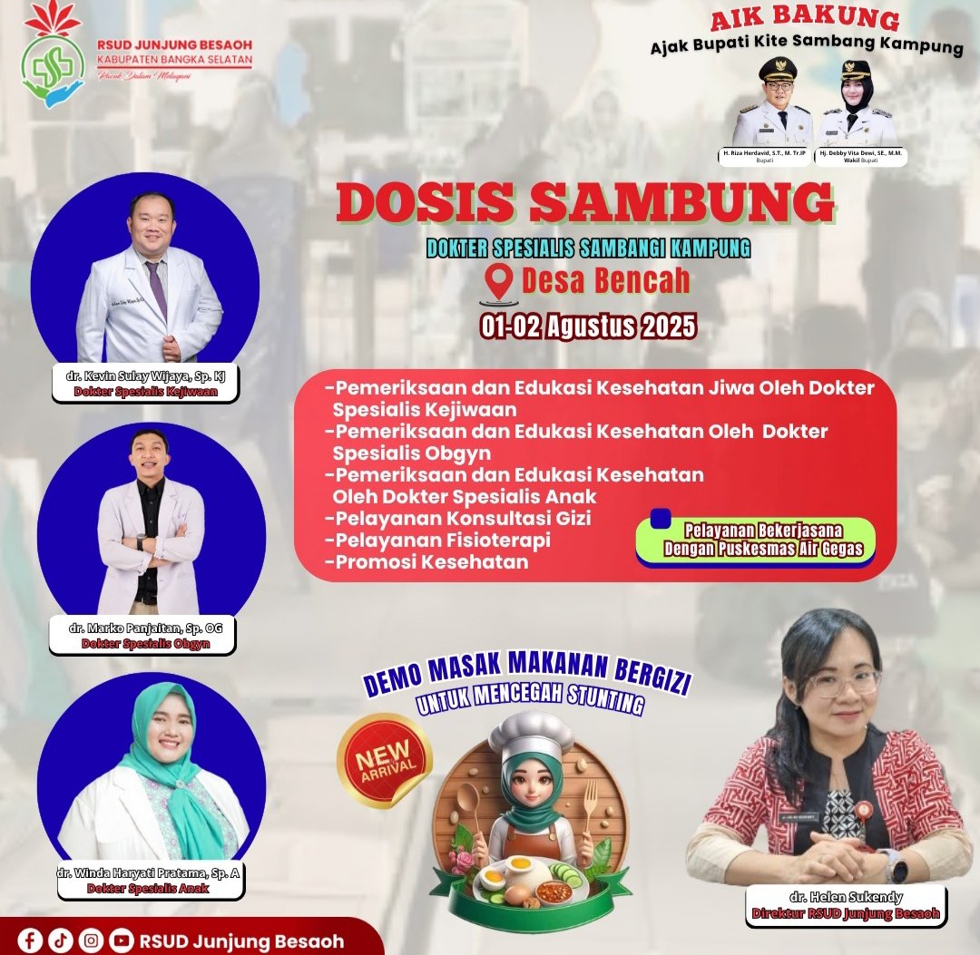 TOBOALI, ERANEWS.ID – RSUD Junjung Besaoh terus berinovasi dalam meningkatkan pelayanan kesehatan bagi masyarakat. Kali ini, melalui program unggulan “Dokter Spesialis Sambang Kampung” (Dosis Sambung), rumah sakit tersebut akan kembali hadir dalam Program Ajak Bupati Sambang Kampung (Aik Bakung) di Desa Bencah, Kecamatan Air Gegas, Kabupaten Bangka Selatan.