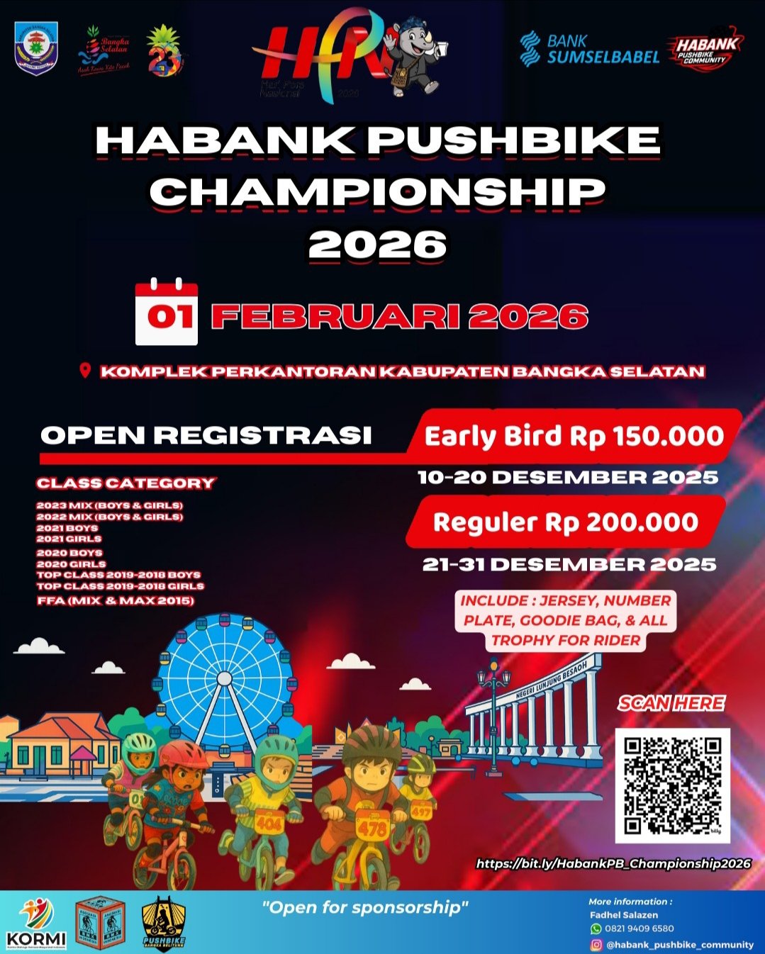 TOBOALI, ERANEWS.CO.ID – Kabar gembira bagi para pecinta olahraga sepeda cilik di Bangka Selatan. Dalam rangka memeriahkan Hari Jadi Kabupaten Bangka Selatan (Basel), ajang bertajuk Habank Pushbike Championship 2026 resmi akan diselenggarakan pada 1 Februari 2026 mendatang.