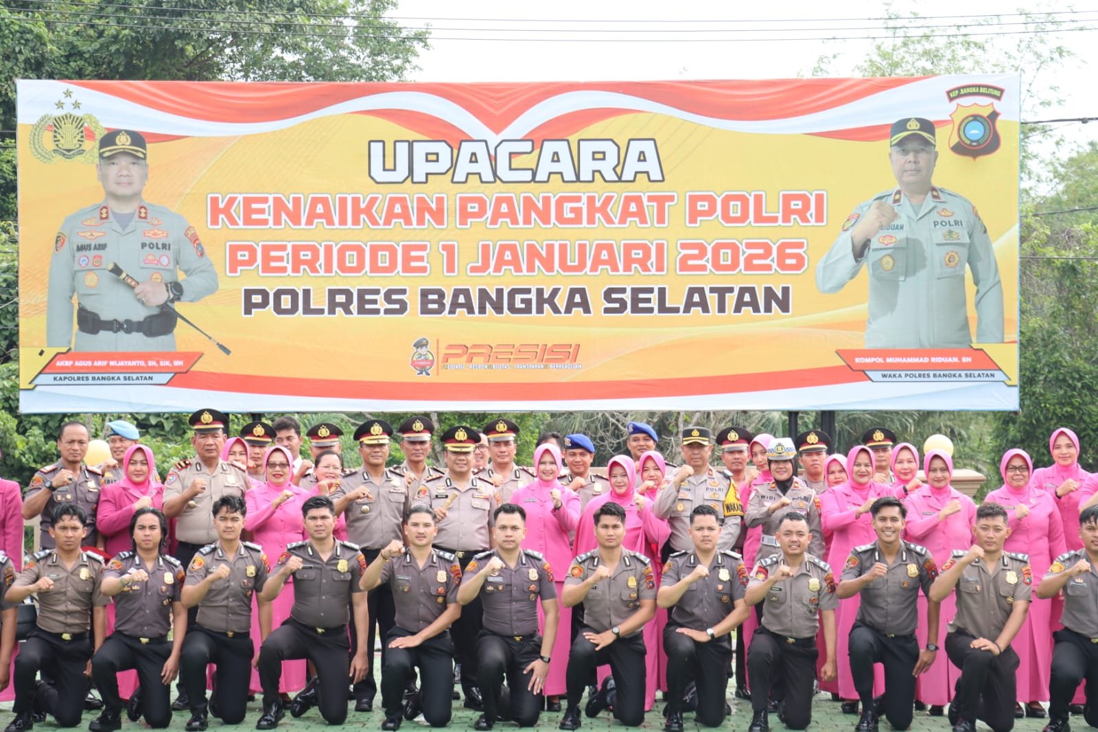 “Hari ini ini ada sebanyak 54 personel Polres Bangka Selatan yang menerima kenaikan pangkat periode 1 Januari 2026. Dengan rinciannya, 2 perwira dari pangkat Iptu ke AKP, 8 personel dari Aipda ke Aiptu, 19 personel dari Bripka ke Aipda, 1 personel dari Brigadir ke Bripka, 10 personel dari Briptu ke Brigadir, serta 14 personel dari Bripda ke Briptu,” kata Agus Arif.