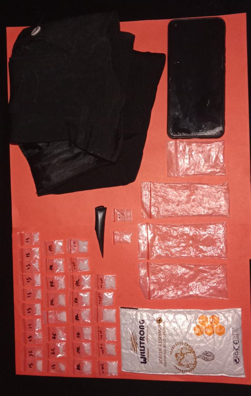 Adapun barang bukti yang berhasil diamankan petugas yaitu 32 paket diduga narkotika jenis sabu dengan berat Bruto 10,96 gram, 2 bungkus plastik bening Berukuran Kecil Kosong, 1 bungkus plastik bening berukuran sedang kosong, 3 bungkus plastik bening berukuran besar kosong, 1 buah plastik berwarna putih bertuliskan Willstrong, 1 buah sekop dari pipet minuman berwarna hitam,1 helai celana panjang berwarna hitam, 1 unit Handphone merk Realme berwarna Silver.