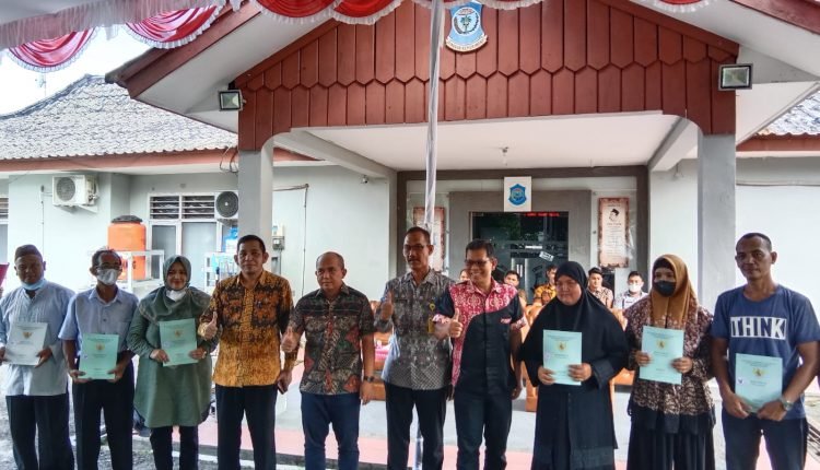 PANGKALPINANG, ERANEWS.CO.ID – Wali Kota Pangkalpinang, Dr. H. Maulan Aklil atau yang akrab disapa Molen bersama Badan Pertanahan Nasional (BPN) menyerahkan Sertifikat Program Pendaftaran Tanah Sistematis Lengkap (PTSL) tahun 2022 bagi warga Kecamatan Bukit Intan di Halaman Kantor Kecamatan Bukit Intan Kota Pangkalpinang, Kamis (12/01/2023).