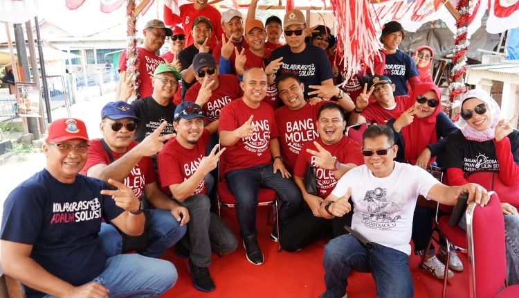 Kompak mengenakan baju kaos warna merah bertuliskan “Bang Molen, Kota Beribu Senyuman”, rombongan ini memberi hormat di depan panggung podium seraya membagikan kaos-kaos ke masyarakat yang menonton di area tersebut.